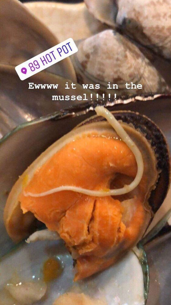 But on that day, we had the most frustrated and disgusting experience. Like every other time, we ordered two separate hot pots. And after finish nearly half of her portion, my friend found in the mussel there was A WORM! Take a look at the picture we took below guys.